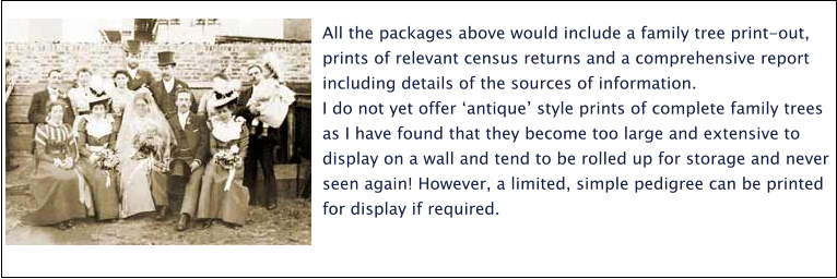 All the packages above would include a family tree print-out, prints of relevant census returns and a comprehensive report including details of the sources of information.  I do not yet offer ‘antique’ style prints of complete family trees as I have found that they become too large and extensive to display on a wall and tend to be rolled up for storage and never seen again! However, a limited, simple pedigree can be printed for display if required. This category covers specific research requests such as: •	"Can you find my grandfather's second wife?" •	"I'm sure my grandmother had a brother - can you find him?" •	or online research of available parish records for a specific item Contact me to see if I can answer your question! Specific Research Requests - £30 per hour