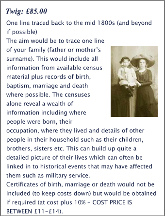 One line traced back to the mid 1800s (and beyond if possible) The aim would be to trace one line of your family (father or mother’s surname). This would include all information from available census material plus records of birth, baptism, marriage and death where possible. The censuses alone reveal a wealth of information including where people were born, their occupation, where they lived and details of other people in their household such as their children, brothers, sisters etc. This can build up quite a detailed picture of their lives which can often be linked in to historical events that may have affected them such as military service.  Certificates of birth, marriage or death would not be included (to keep costs down) but would be obtained if required (at cost plus 10% - COST PRICE IS BETWEEN £11-£14). Twig: £85.00 Two lines traced back to the mid 1800s (and beyond if possible) The aim would be the same as the package above but would include details of two lines of your family (both father and mother’s surnames). Certificates of birth, marriage or death would not be included (to keep costs down) but would be obtained if required (at cost plus 10%). Branch: £150.00 All lines traced back to the mid 1800s (and beyond if possible) The aim of this package is the same as those above but tracing details of as many of your ancestors as possible on both sides of your family.  Certificates of birth, marriage or death would not be included (to keep costs down) but would be obtained if required (at cost plus 10%). Root: £325.00